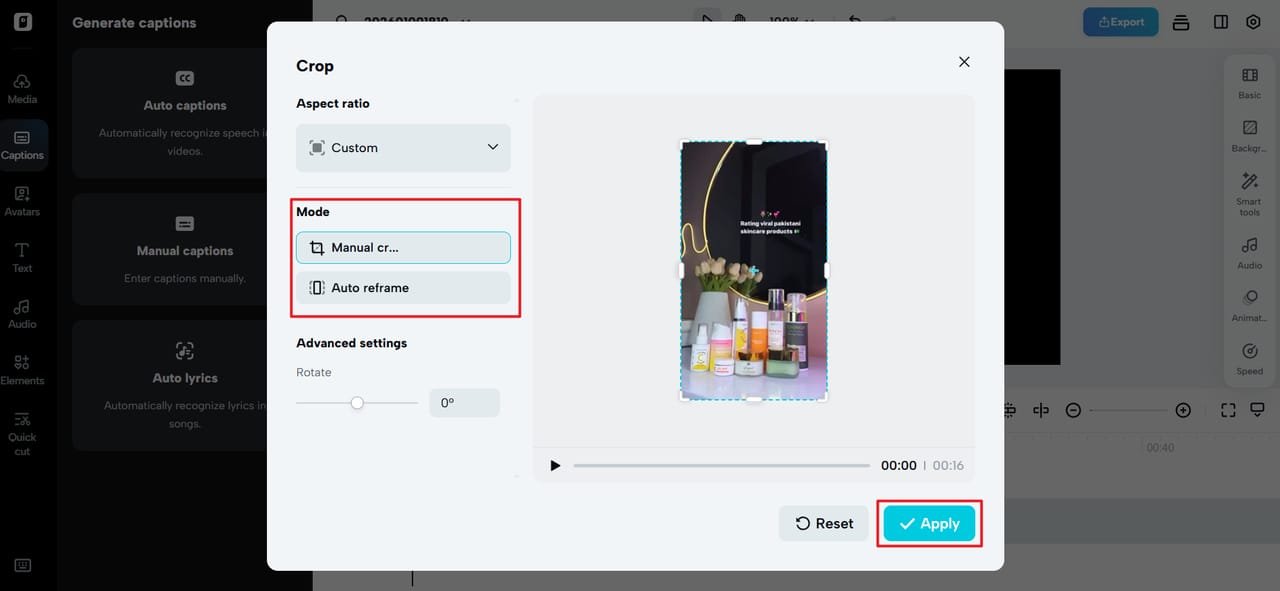 Click Select Smart Tools, and then choose Auto Reframe from the dropdown menu. Now, choose the Aspect Ratio and then click Manual Crop or Auto Reframe to remove the watermark, font, and caption from the video and resize it to your preference.