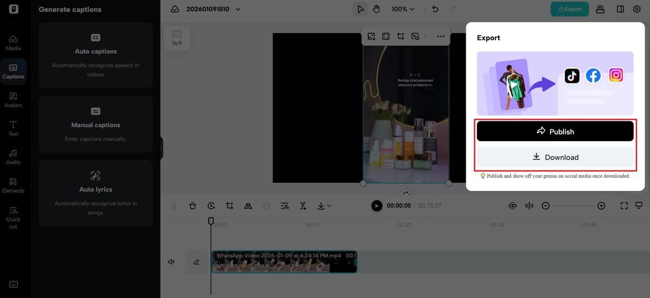 Click “Export” (top-right corner) and select “Publish” or “Download.” Customize the export options and click “Export” to download the video to your PC or share it on social media. What you publish now is familiar—but but fresh, accurate, and reusable.